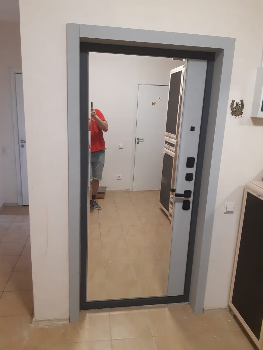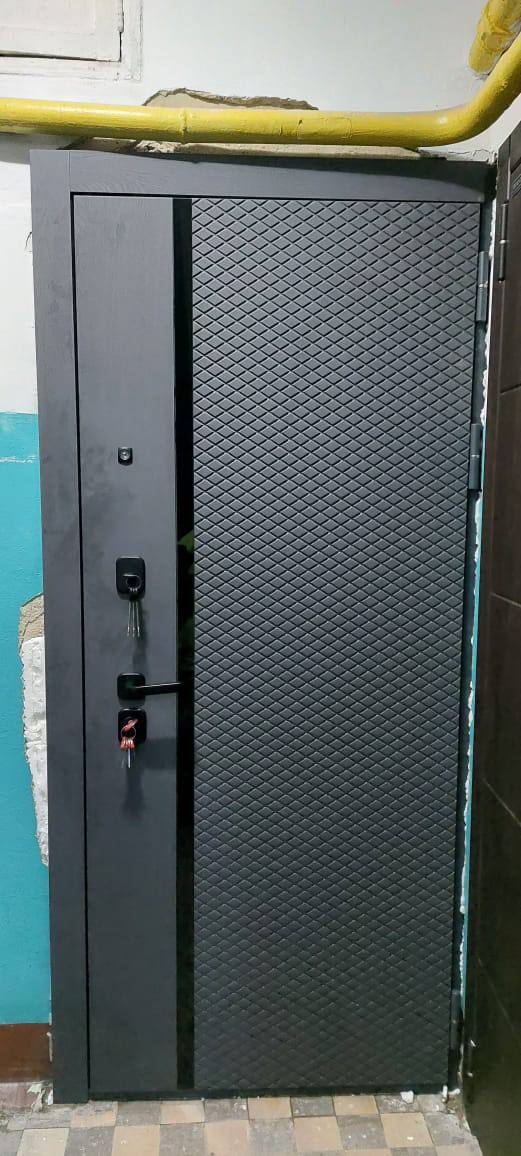Экошпон.Наружный лист металла 1,5 мм. Дизайн панели ФЛС СО ВСТАВКОЙ ЧЕРНАЯ ЛАКОБЕЛЬ Объемная фрезеровка МДФ 10 мм, цвет «Ясень графит»; Наличник МДФ 80 мм, гладкие